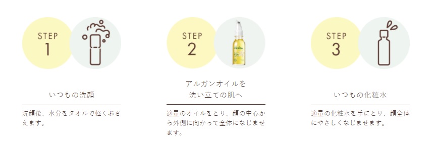 洗顔後すぐ、化粧水の前に、1、2滴のアルガンオイルを馴染ませるだけで、保湿力が高まりしっとりしたお肌に。