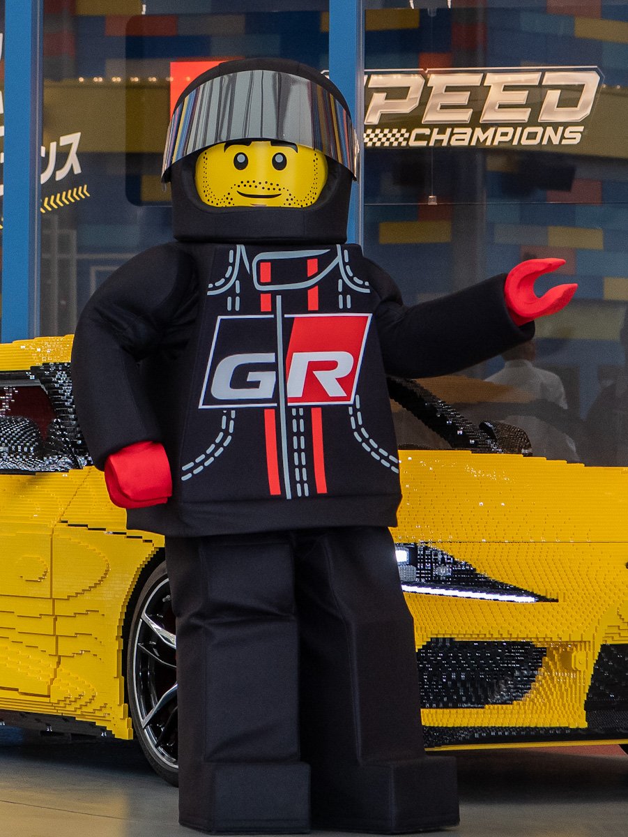 TGRのレーシングスーツを着たレゴランド・ジャパンの新キャラクター・ジーアールくんや