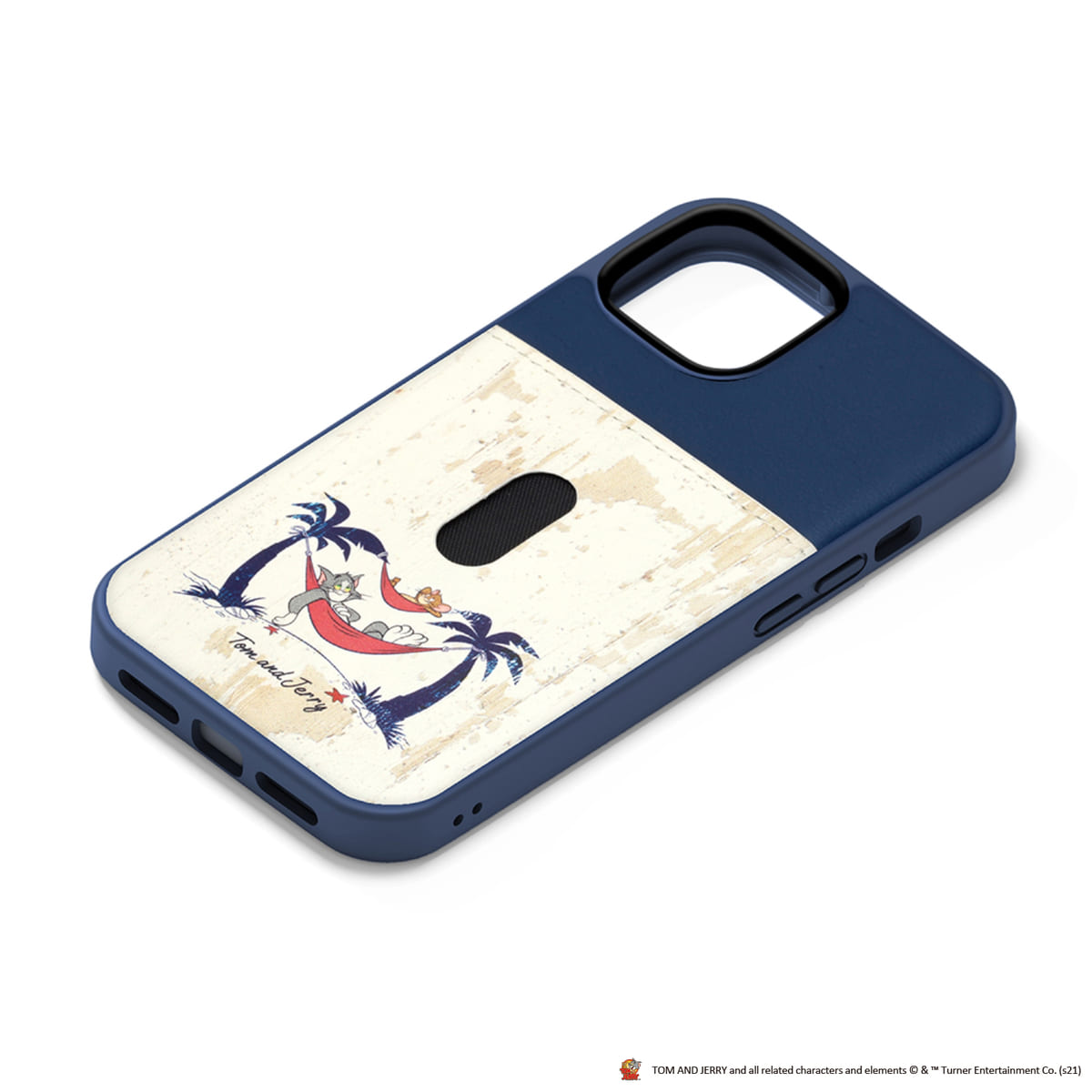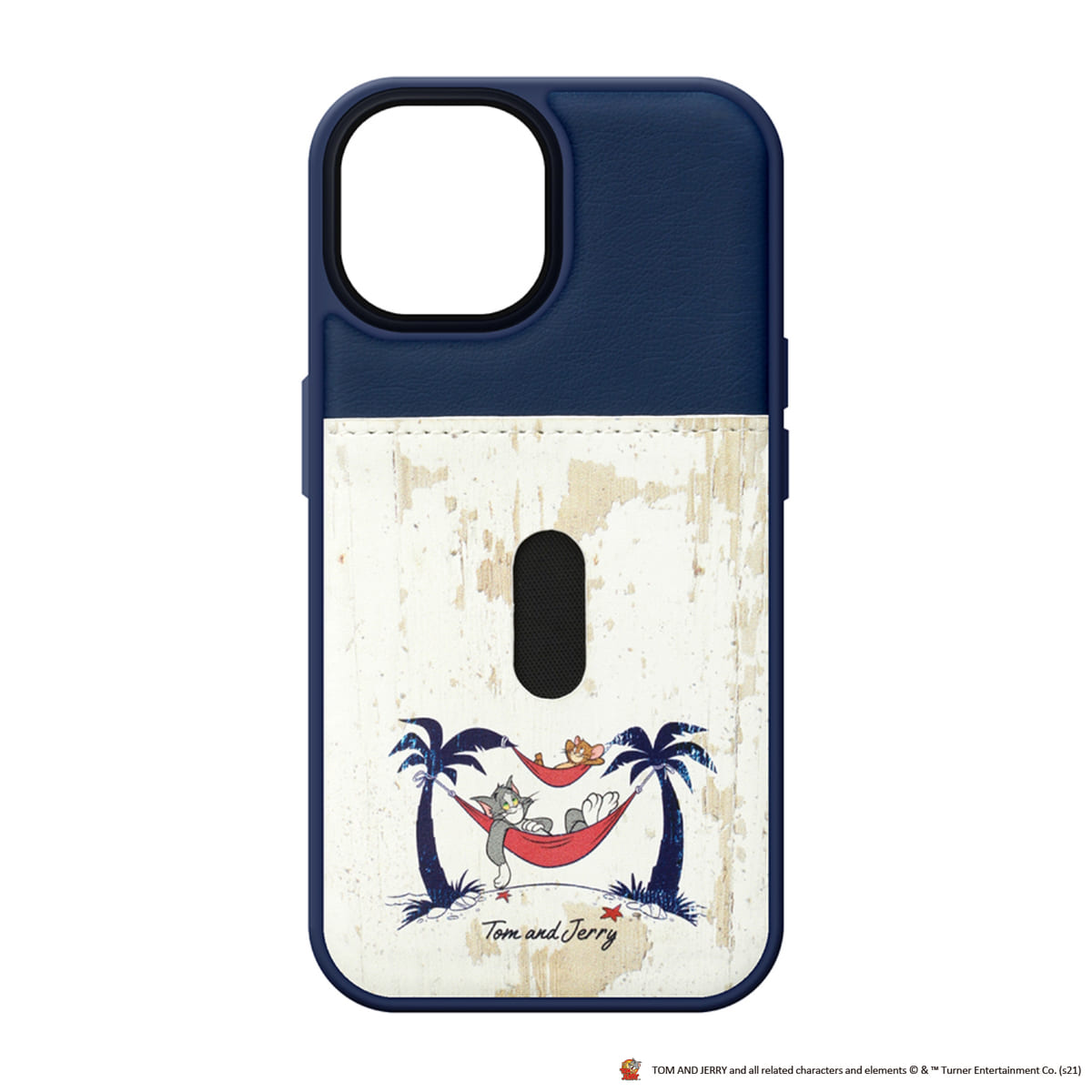 ネイビーのタフポケットケースには「トム」と「ジェリー」の2人が、南国でくつろぐシーンを使用。
