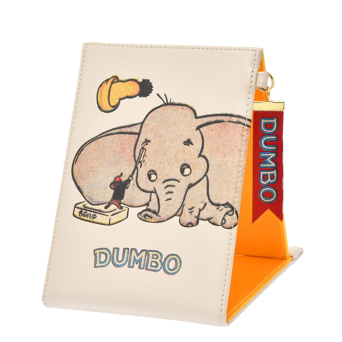 アイボリー色のレザー風カバーに「ダンボ」と「ティモシー」がレイアウトされた折りたたみミラー。