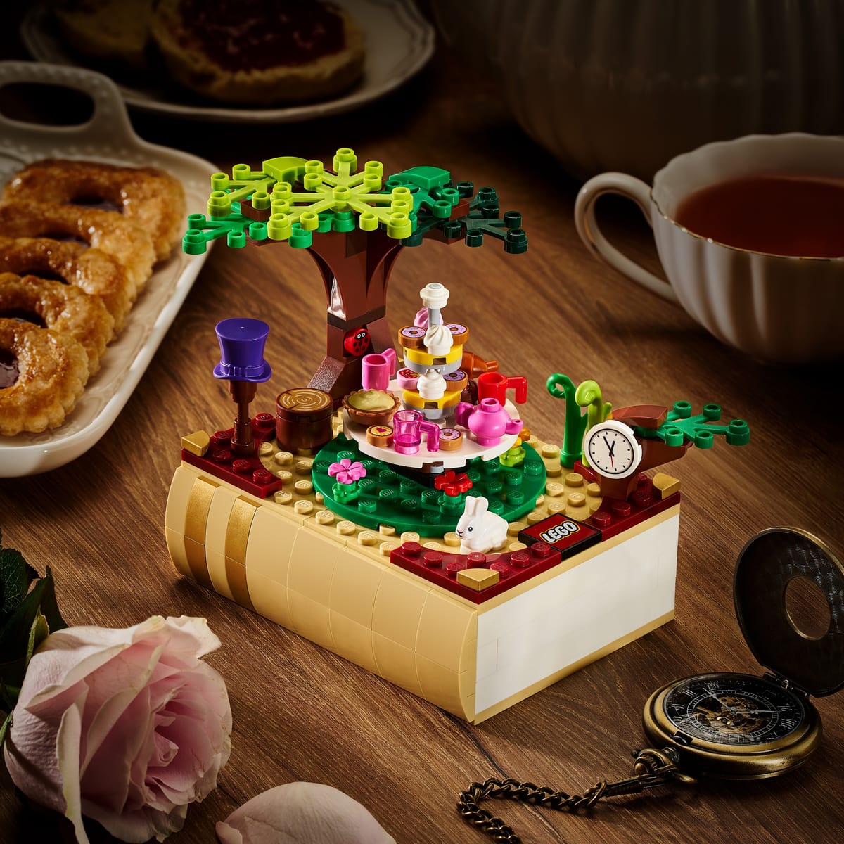 パーツを組んでいくと、アリスがシュールなお茶会に参加するシーンが本のモチーフの上に誕生します。