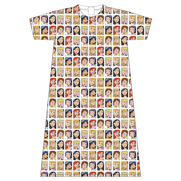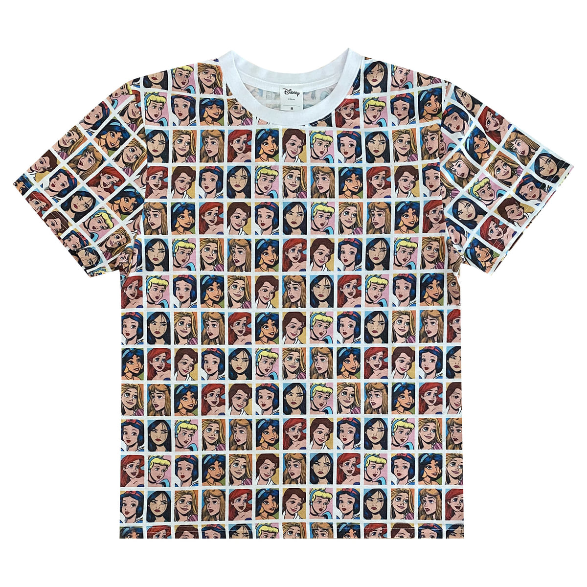 「ディズニープリンセス」たちが描かれたスクエア型のアートを並べた生地がおしゃれなカジュアルTシャツシリーズ。