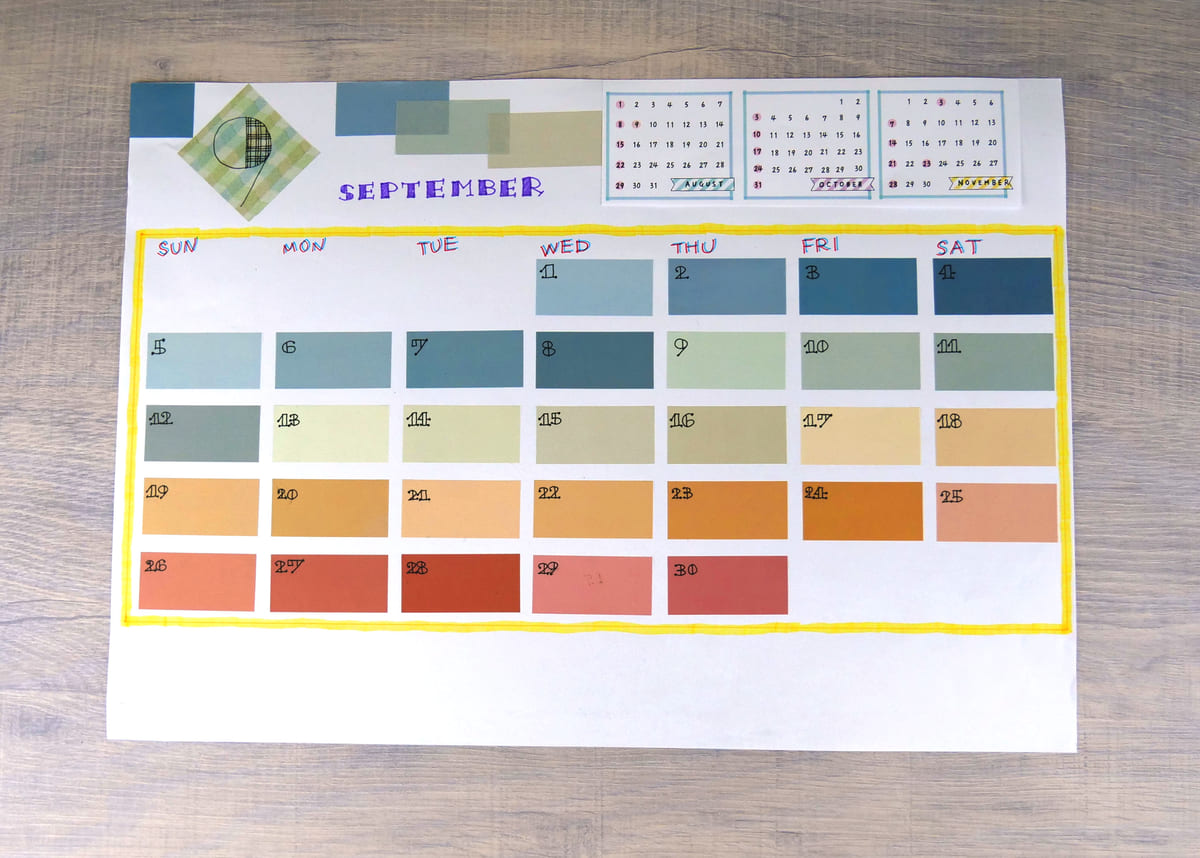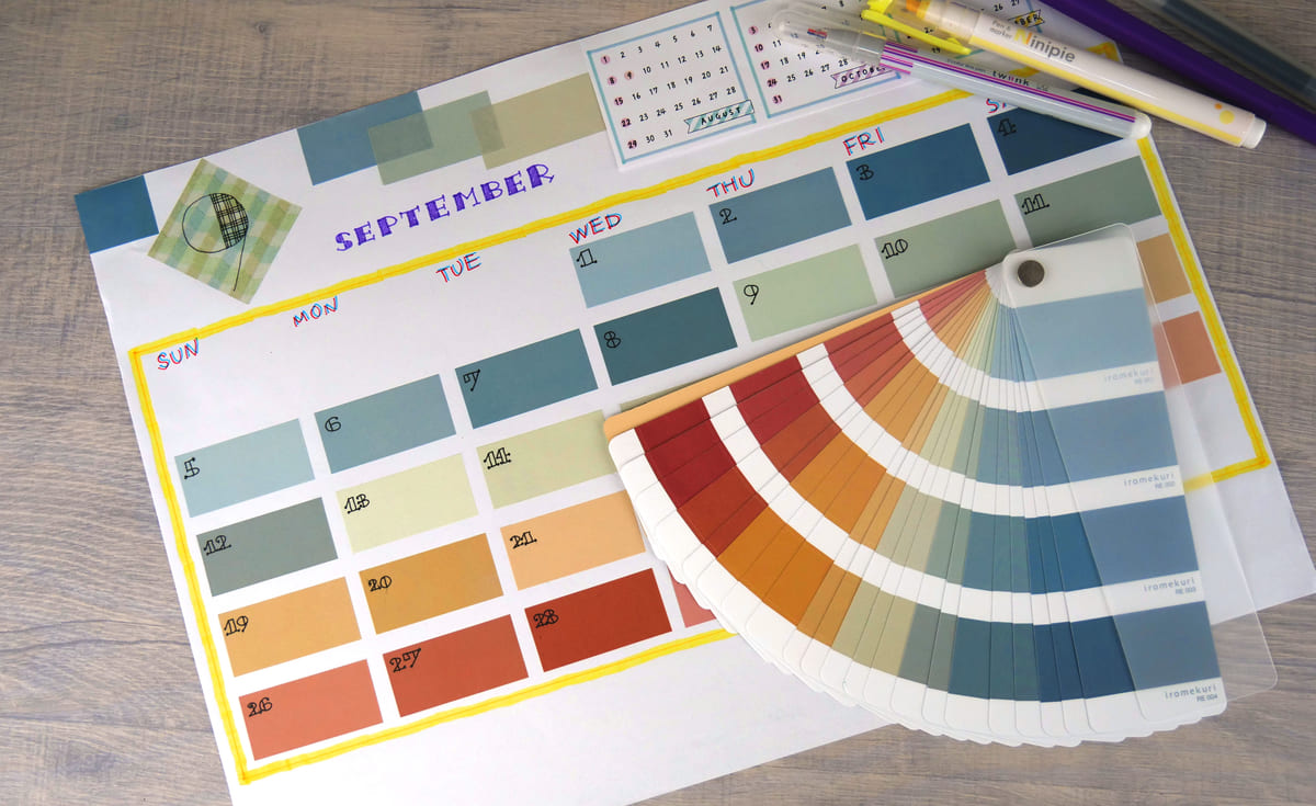 1行に7枚ずつ並べて貼り、日付を入れれば、カラフルでありつつも調和のとれた色彩のオリジナルカレンダーがあっという間に完成!