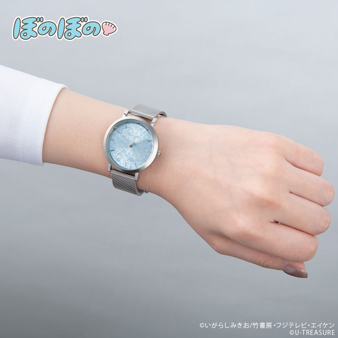 印象的な淡いブルーの文字盤には、ラッコの子ども「ぼのぼの」をベースに「シマリスくん」や「アライグマくん」「スナドリネコさん」など、様々なキャラクターをデザイン。
