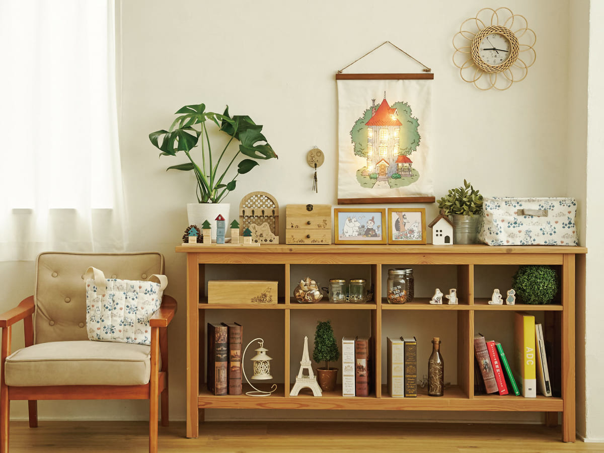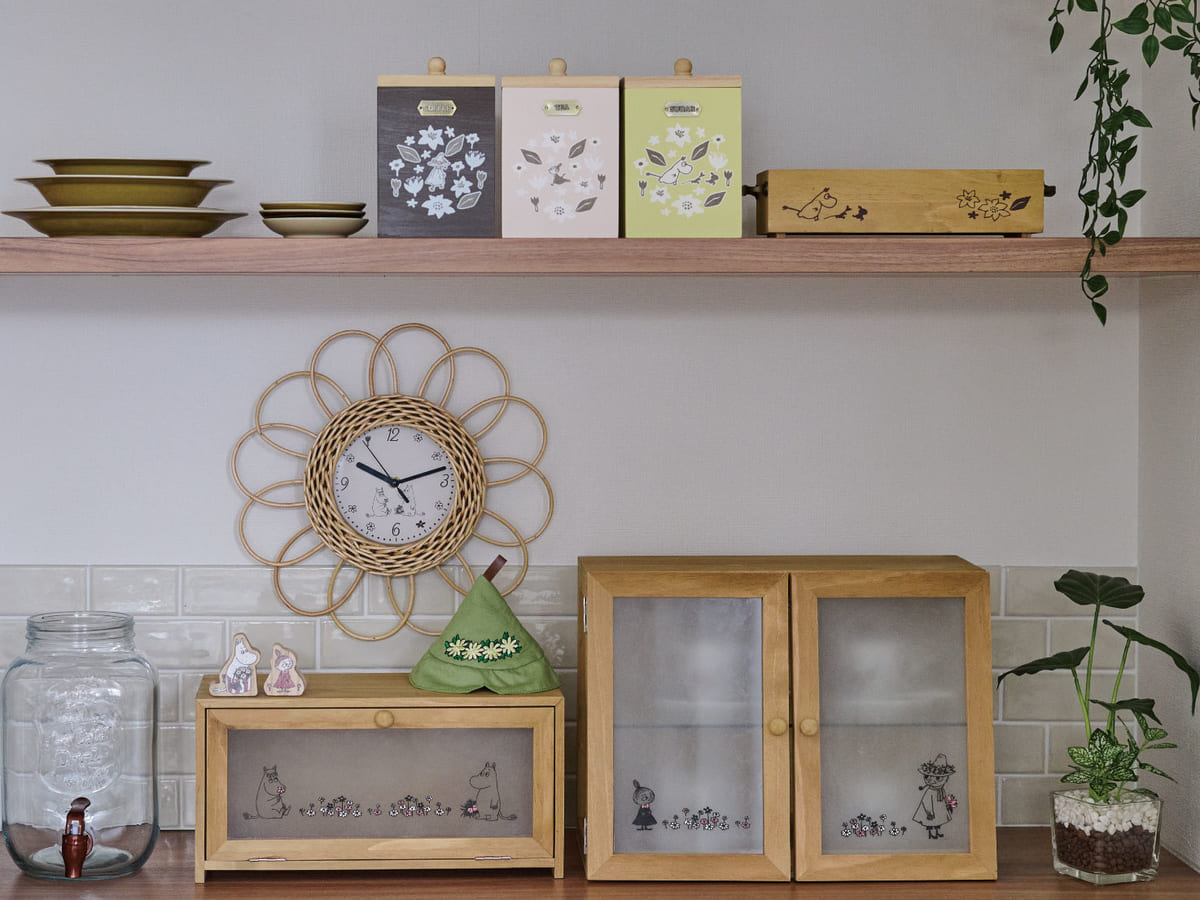 オリジナルの総柄プリントを使用した収納ボックスや、ムーミン谷の仲間たちがデザインされたティッシュケースなど、ナチュラルで暖かみを感じられるグッズがラインナップ。