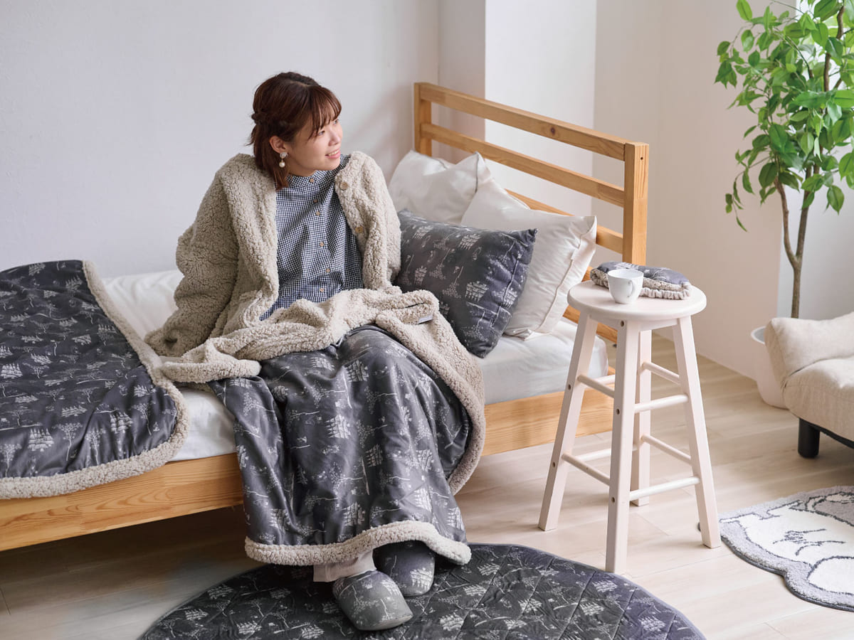 足元を暖めてくれるひざ掛けやスリッパ、ふかふかのクッションなどがお揃いデザインで登場します。