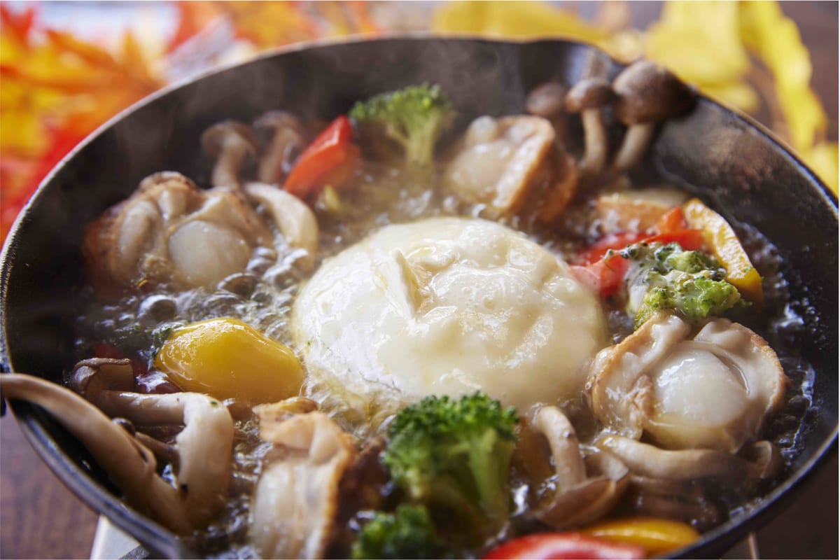 キノコとまるごとカマンベールチーズを使用した、秋の味覚を楽しむアヒージョ。
