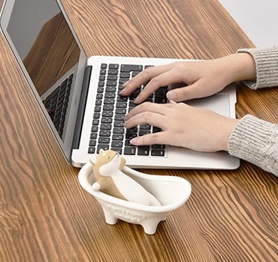 両前足をバスタブの縁にかけて、ゆったりとくつろぐ姿に癒されること間違いなしの加湿器です。