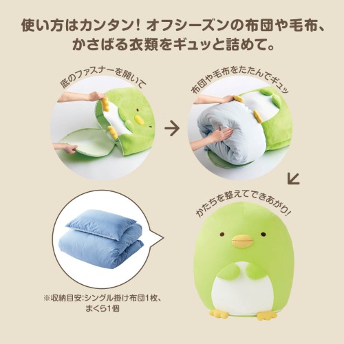 見た目は大きなぬいぐるみですが、シーズンオフのお布団や毛布、かさばる衣類をたっぷり収納できます。