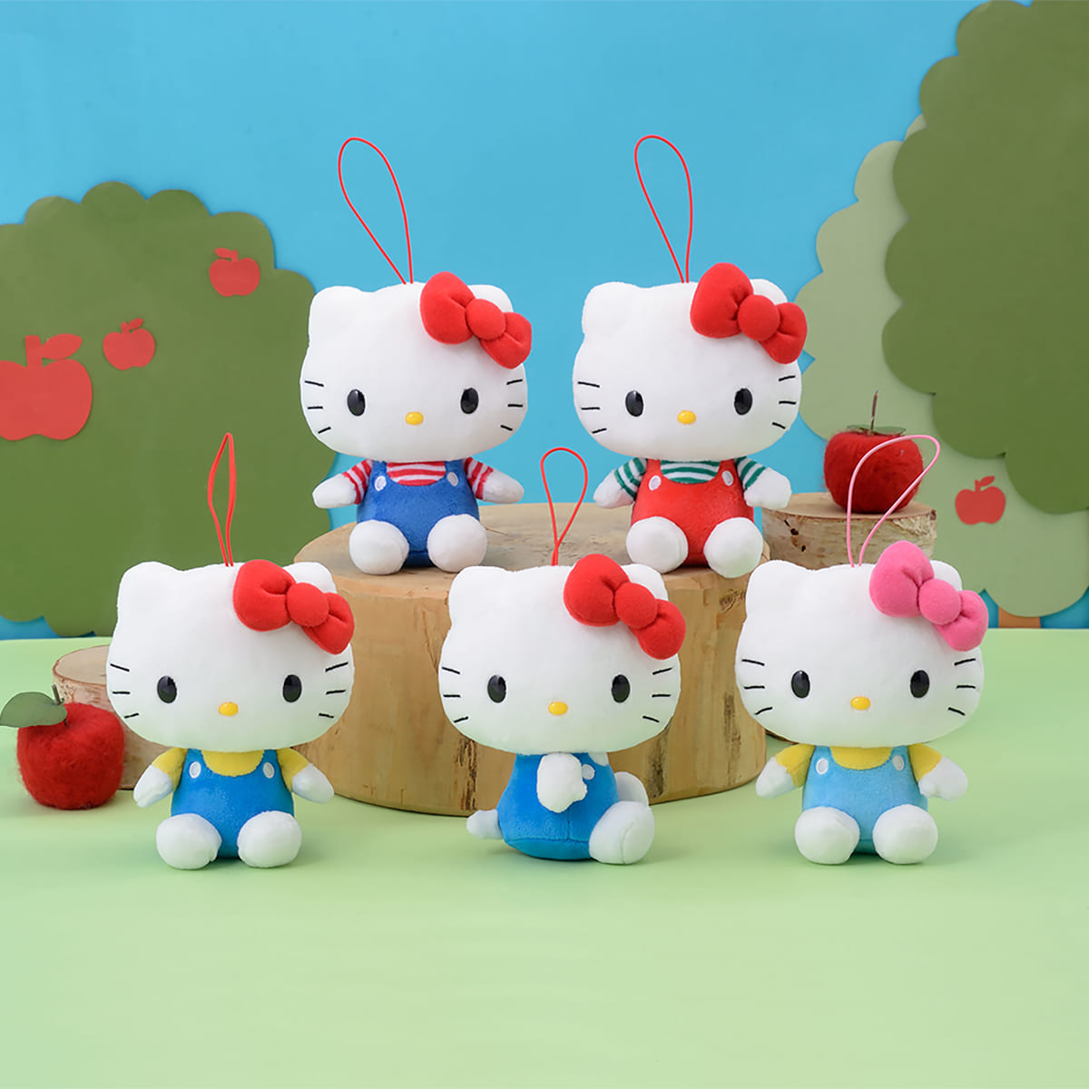 王道中の王道をいく、「ハローキティ」がオーバーオールを着てちょこんと座ったポーズのぬいぐるみです。