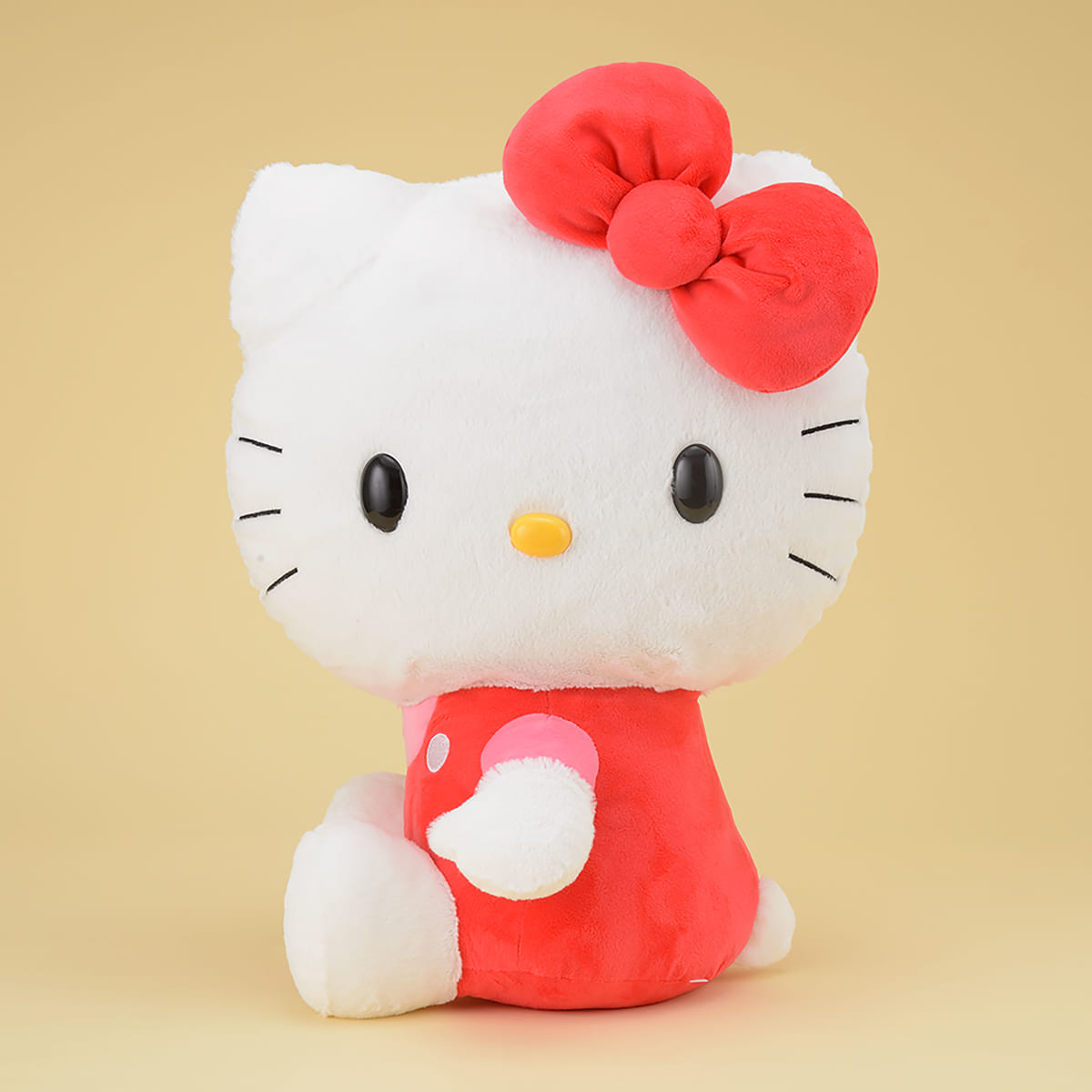 赤いオーバーオールを着た、スタンダードな「ハローキティ」のビッグサイズぬいぐるみです。