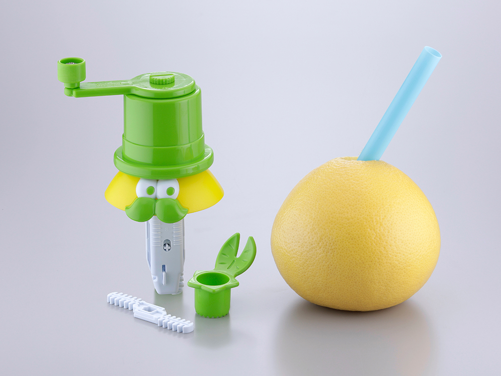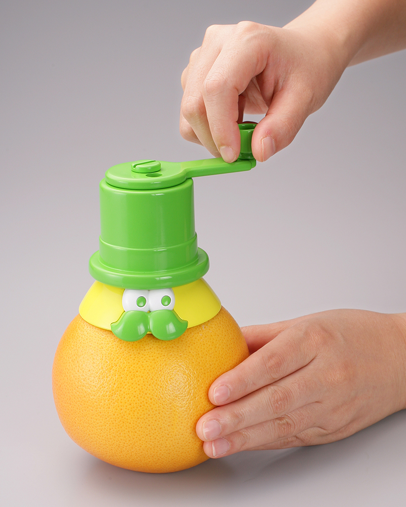使い方は、グレープフルーツのヘタを「ヘタ取りパーツ」で引き抜き、空いた穴に本体を挿し込みます。