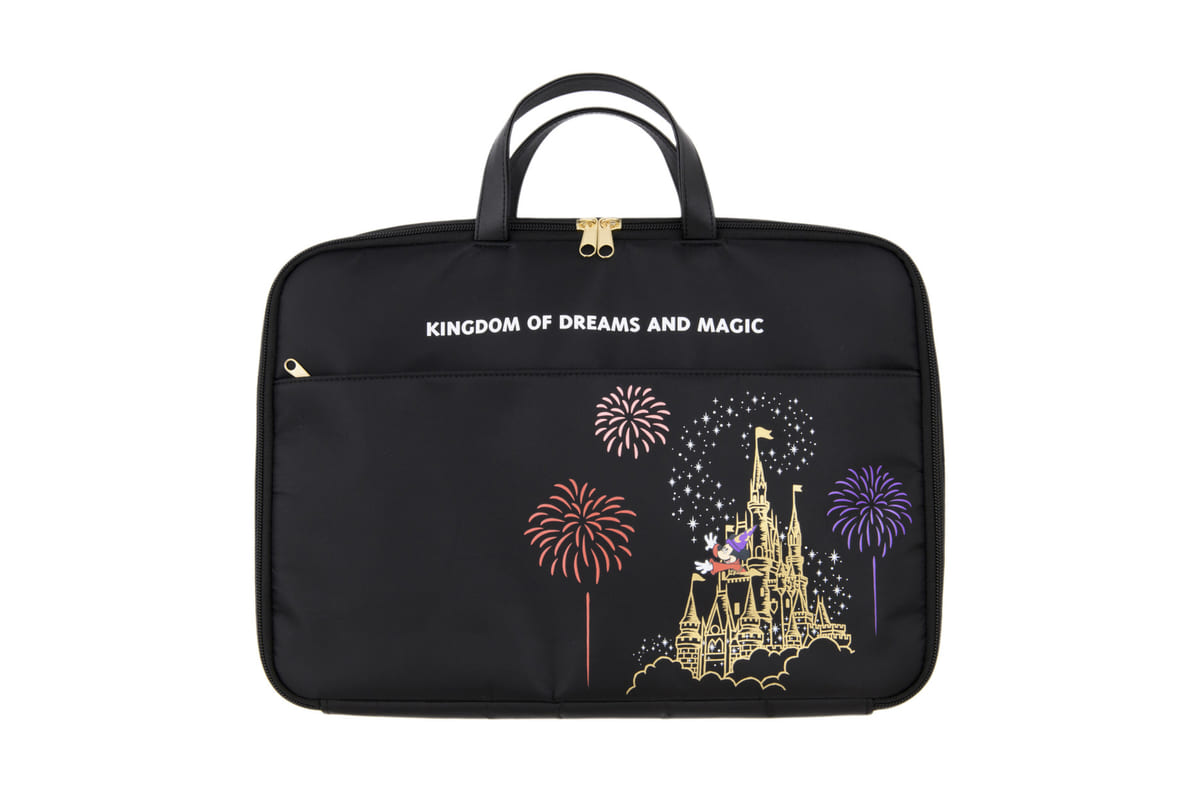夜空に浮かぶ花火とシンデレラ城、「ミッキーマウス」のデザインのノートパソコンケース。