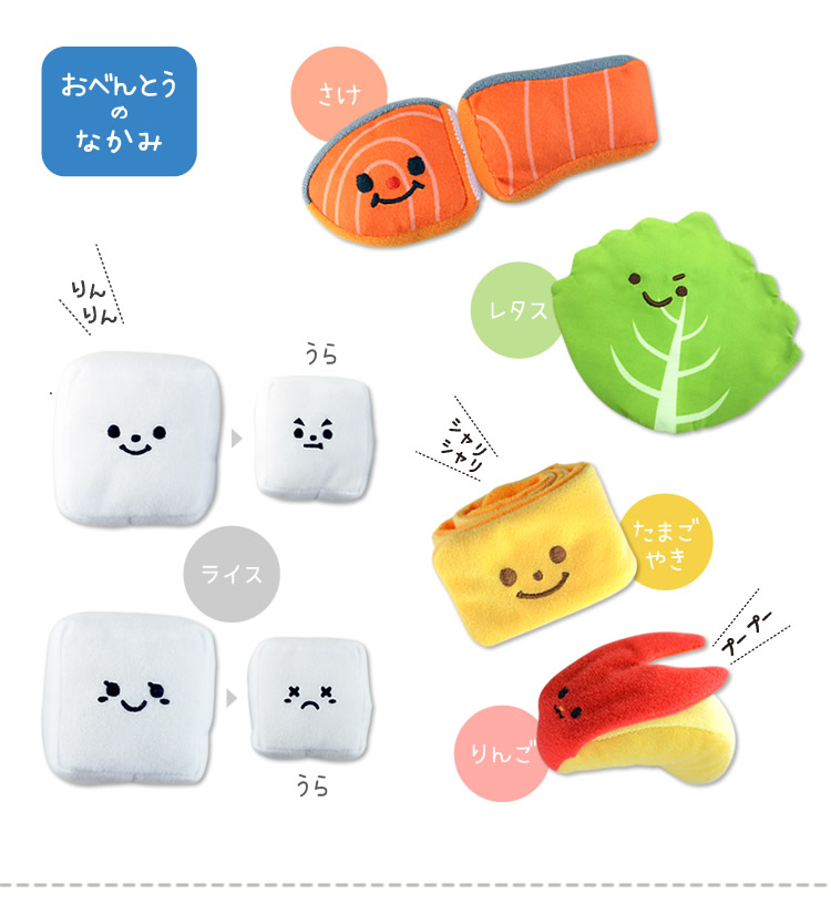 面ファスナー付きの「さけ」は、ふたつに分けたりくっつけたり、鈴の入った「ライス」を振って音を鳴らしてみたり。