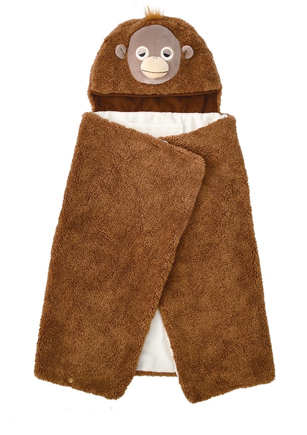 オラウータンの「ウータン」フェイスのフードが付いた5WAYブランケットです。