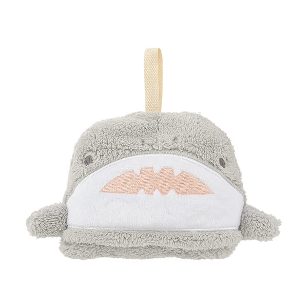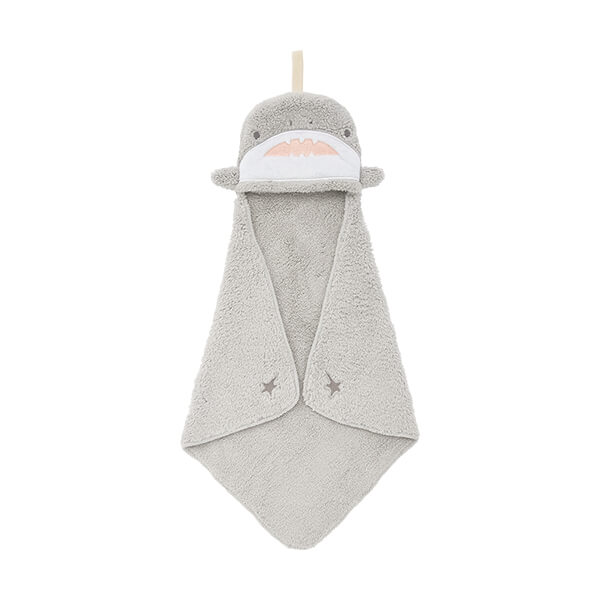 口元から鋭い牙をのぞかせている「サメ」のポケットタオル。