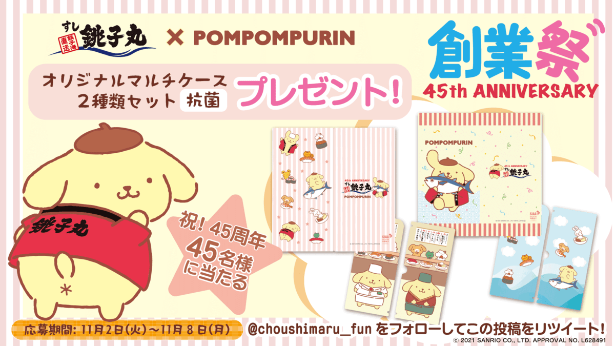 「すし銚子丸」の公式Twitterアカウント(@choushimaru_fan)をフォロー&リツイートで、「銚子丸×ポムポムプリン オリジナル抗菌マルチケース(2種セット)」が抽選で45名様に当たるキャンペーン。