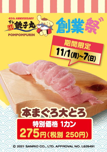 回転寿司店「すし銚子丸」の創業45周年を記念して「ポムポムプリン」との初コラボレーションイベント「45th ANNIVERSARY創業祭」を、2021年10月22日(金)より開催!