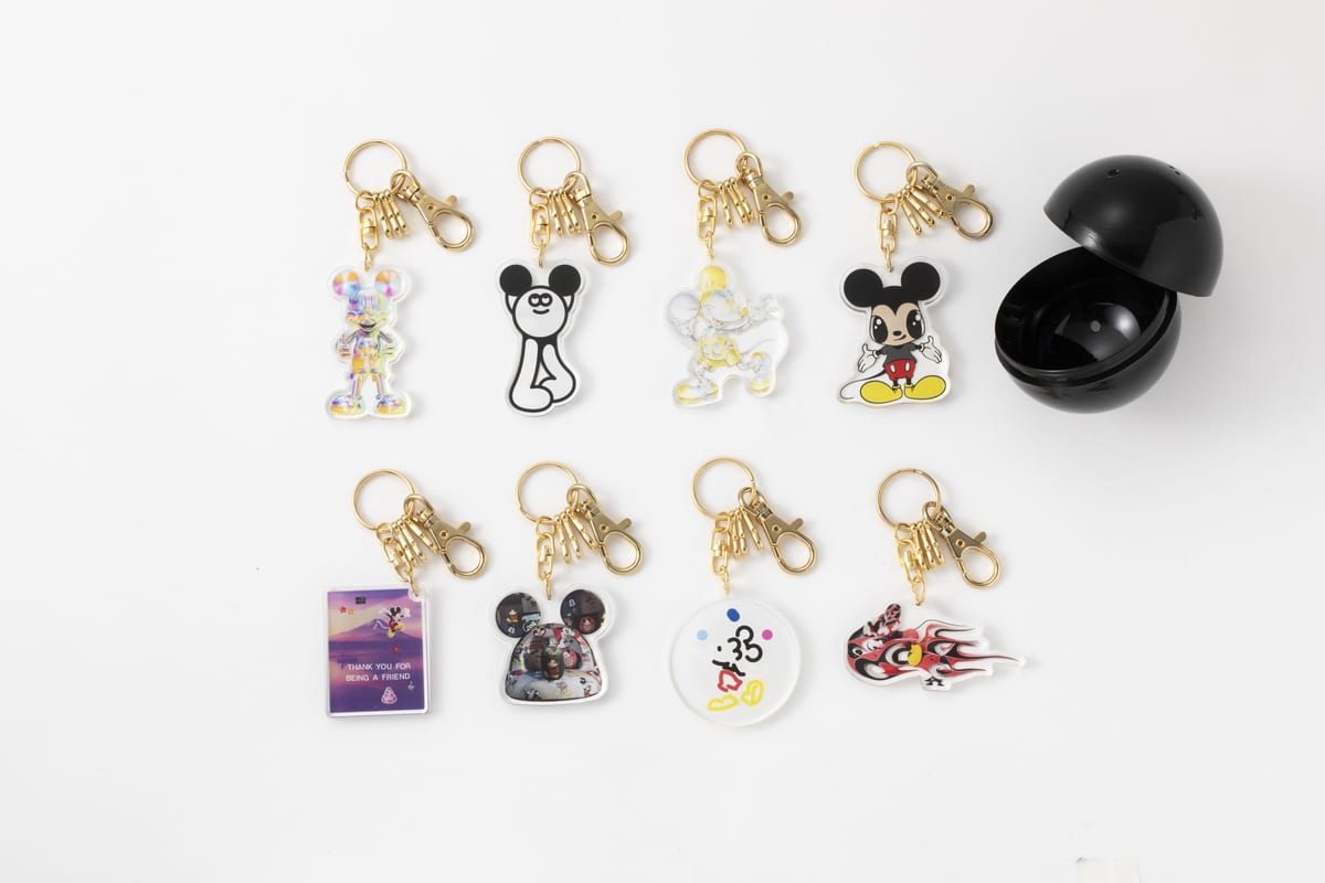 「Mickey Mouse Now and Future」に参加するアーティストのアートを使ったカプセルトイキーホルダー。