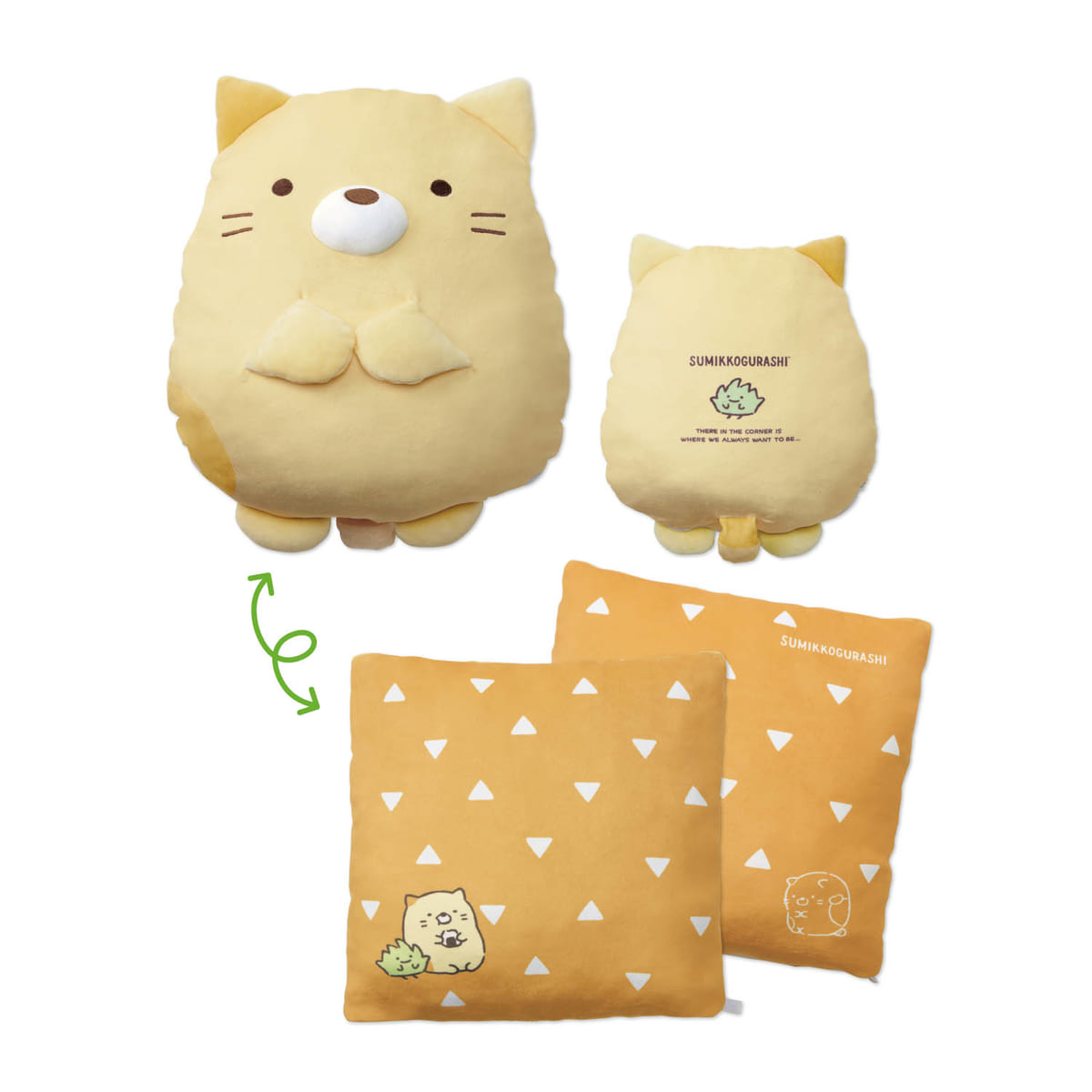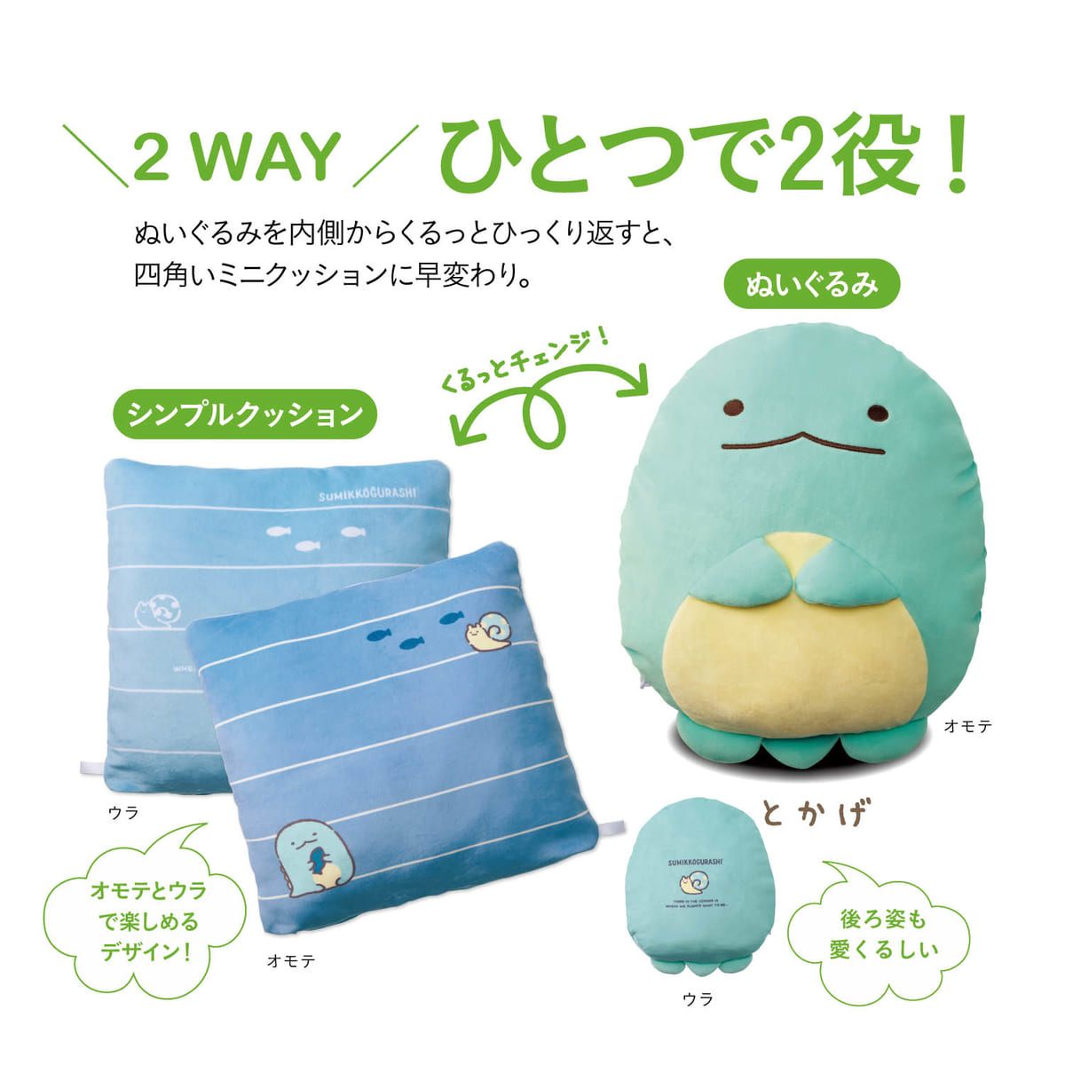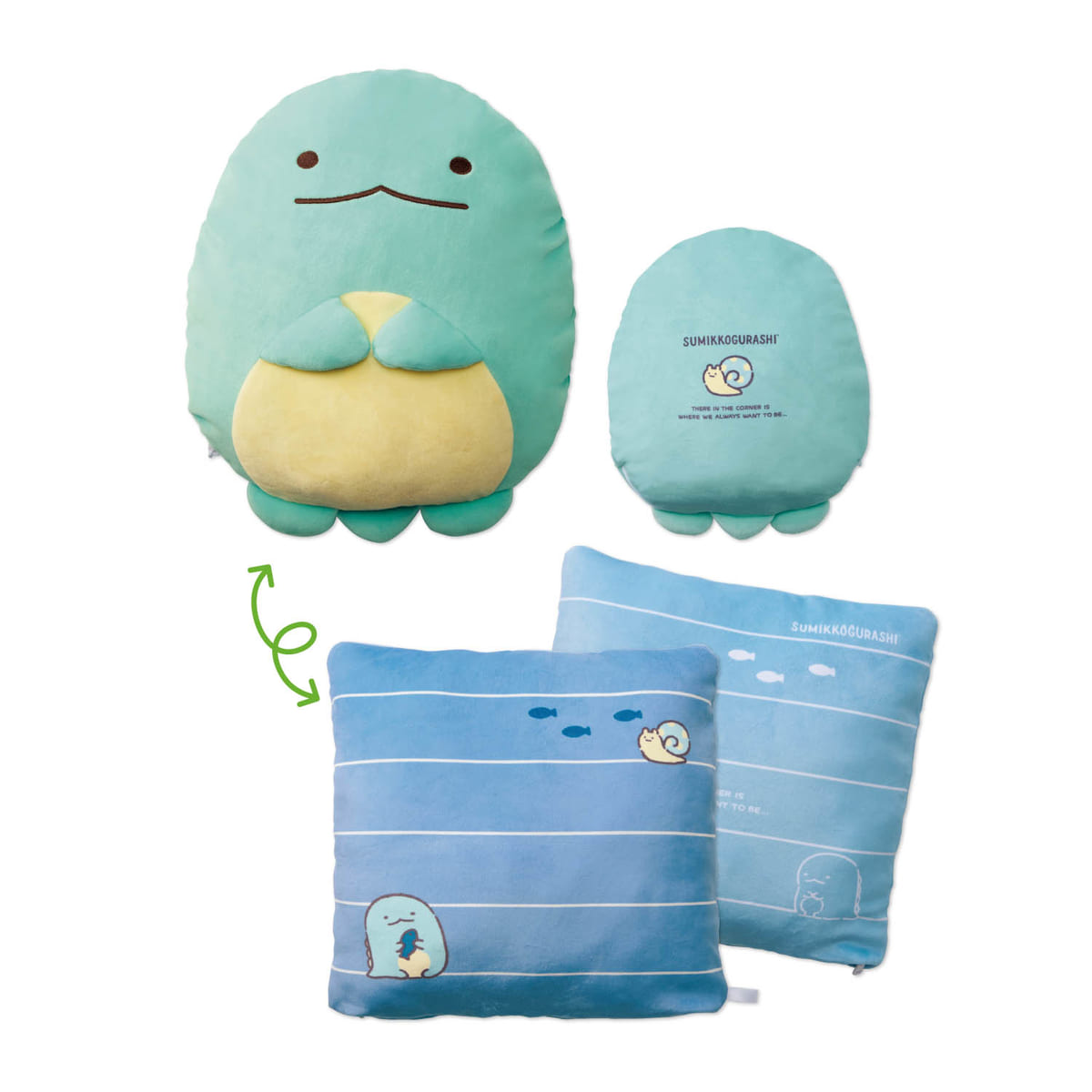「すみっコぐらし」のぬいぐるみ型クッションを、内側からくるっとひっくり返すと、四角いミニクッションに早変わり☆