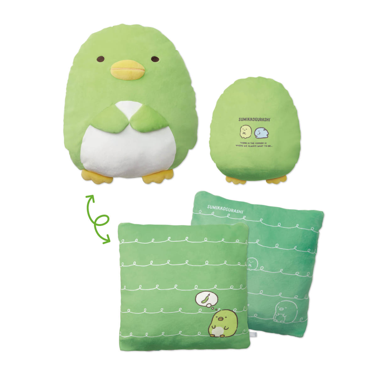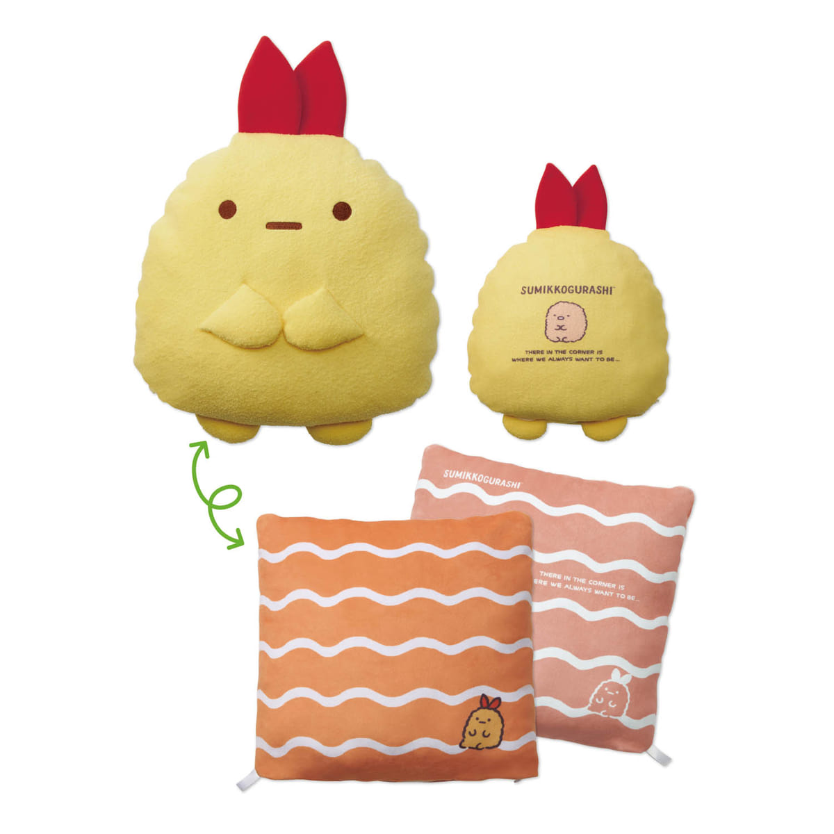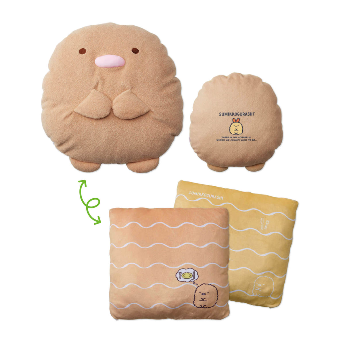 「すみっコぐらし」のぬいぐるみ型クッションを、内側からくるっとひっくり返すと、四角いミニクッションに早変わり☆