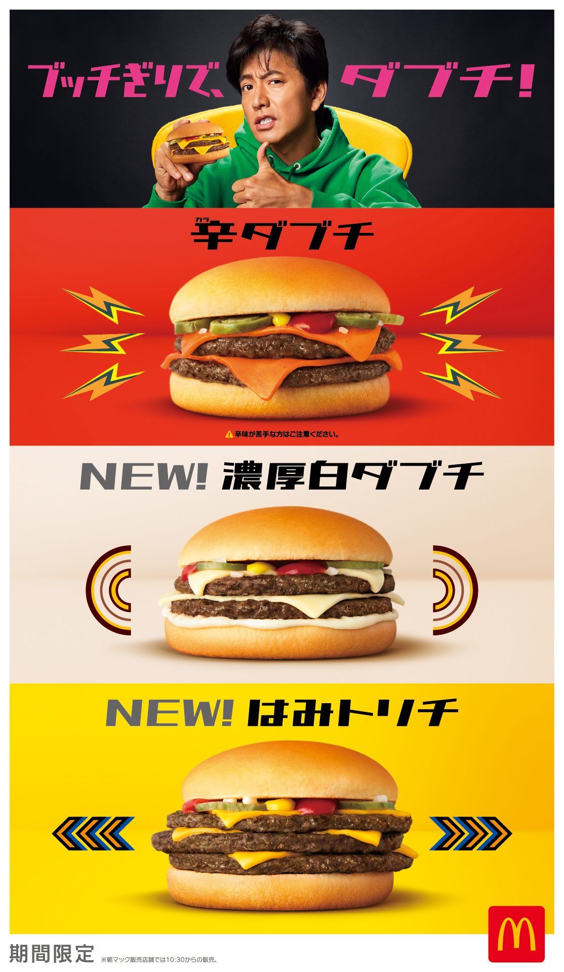 リクエストの声が上がった人気メニュー「辛ダブチ」が復活する他、3種の初登場メニュー、たっぷりとチーズをディップしたような「濃厚白ダブチ」、ダブチ史上最大ボリュームの「はみトリチ」、そして朝マックにも「ダブチソーセージマフィン」がお目見え。