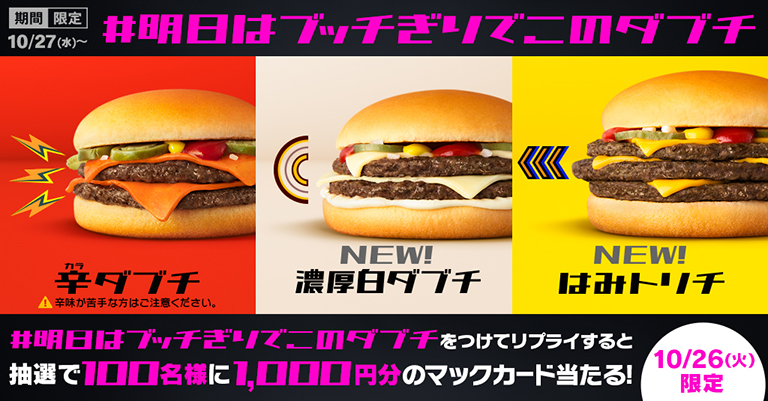 抽選で25名に、1,000円分のマックカードが当たる「#ブッチぎりでダブチ好き」リプライキャンペーン。
