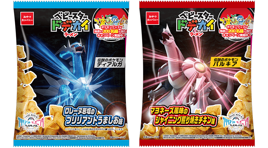 おやつカンパニー ポケモン ベビースタードデカイラーメン「ロレーヌ岩塩のブリリアントうましお味」「マヨネーズ⾵味のシャイニング照り焼きチキン味」