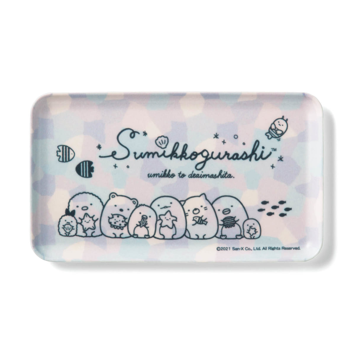 貝殻や魚を手に、一列に並ぶ「すみっコ」たちがキュートなデザインです!