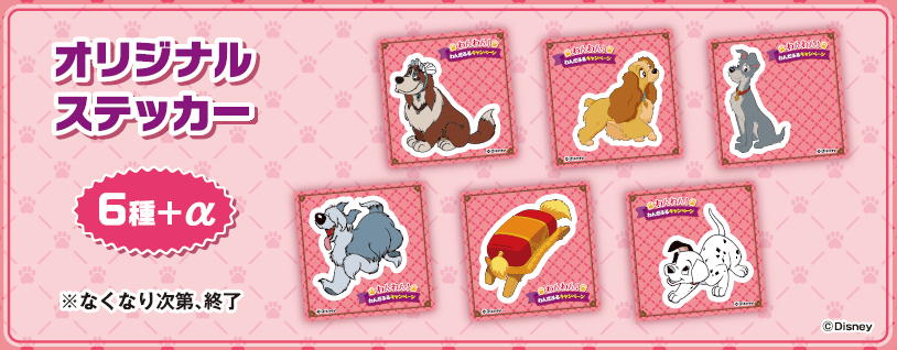 「オリジナルステッカー」には、キャンペーンでグッズ化された6作品のわんちゃんキャラクターがデザインされています。