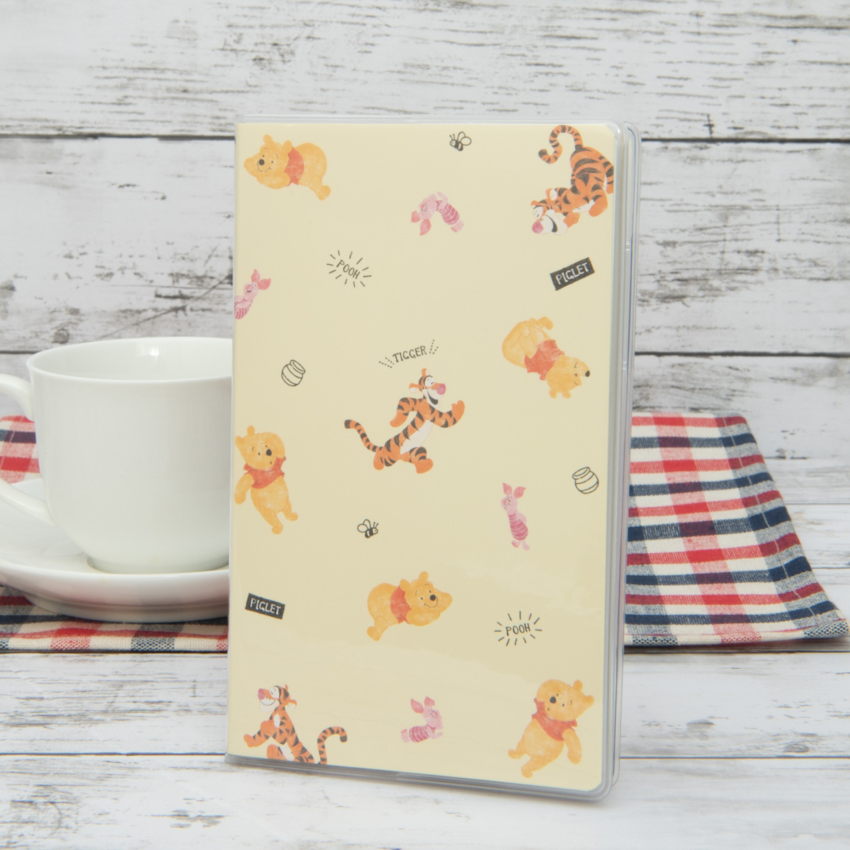 はちみつのような優しいイエローの背景に、「くまのプーさん」たちが賑やかな2022年の手帳。