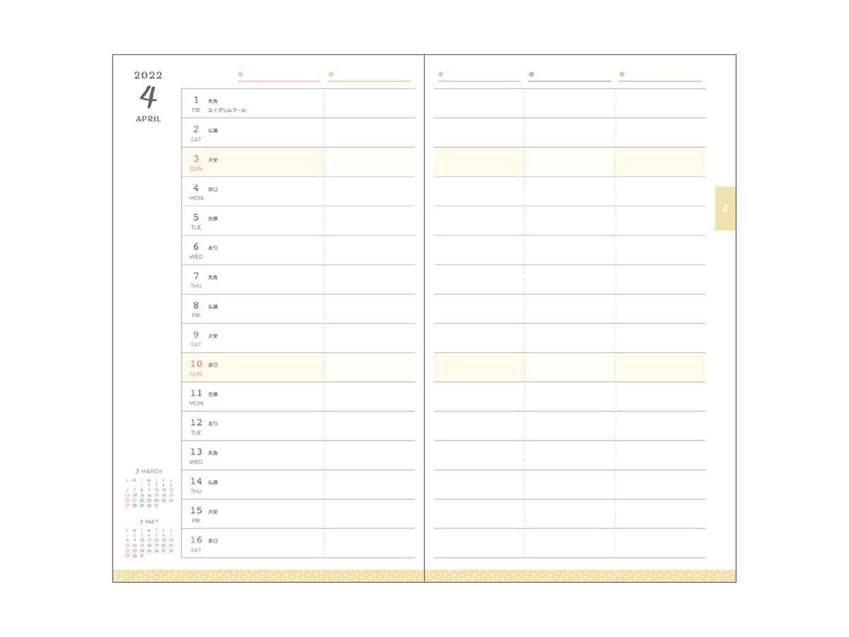 内容:2022年・2023年カレンダー、2022年イヤリープラン、2021年10月~2023年3月マンスリー、メモ、切り取りメモ、郵便料金表、年齢早見表、ID・パスワード、祝・休日一覧、パーソナルデータ、透明塩ビカバー付き