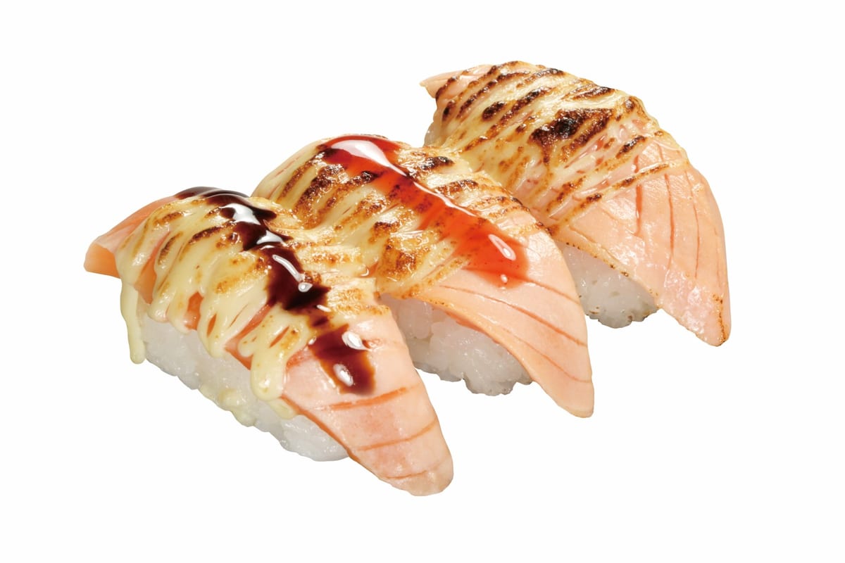 “炎柱”を意識し、人気のサーモンを香ばしく炙り、色合いと辛みで再現したピリ辛ソースなどをトッピング。