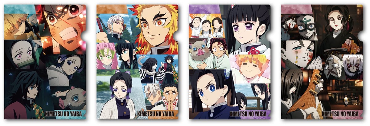 クリアファイルには、「炭治郎」らのほか「宇髄天元」「不死川実弥」「時透無一郎」「甘露寺蜜璃」「伊黒小芭内」「悲鳴嶼行冥」ら柱たちや「栗花落カナヲ」「神崎アオイ」らの登場する蝶屋敷アート、「鬼舞辻無惨」や「魘夢」など鬼のデザインが揃っています。