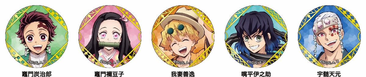 デザインには、主人公の「竈門炭治郎」、その妹の「竈門禰豆子」、同期隊士の「我妻善逸」「嘴平伊之助」の他、鬼殺隊を支える柱たち「冨岡義勇」「胡蝶しのぶ」「煉獄杏寿郎」、鬼殺隊当主「産屋敷耀哉」らが登場しています☆