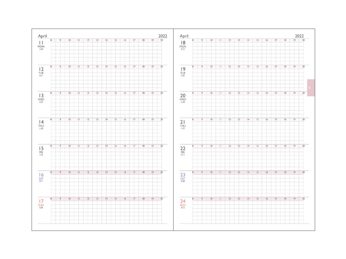 予定欄は時間ごとに細かく書き込め、手帳を使い込みたい人におすすめの内容。