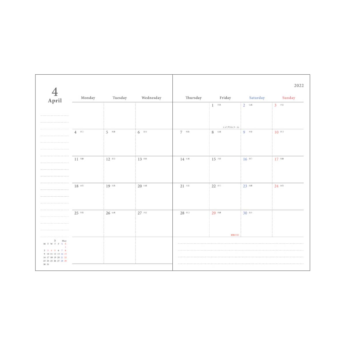 内容:2022年・2023年カレンダー、2022年イヤリープラン、2021年10月~2023年3月マンスリー、メモ、郵便料金表、年齢早見表、ID・パスワード、祝・休日一覧、パーソナルデータ、透明塩ビカバー付き
