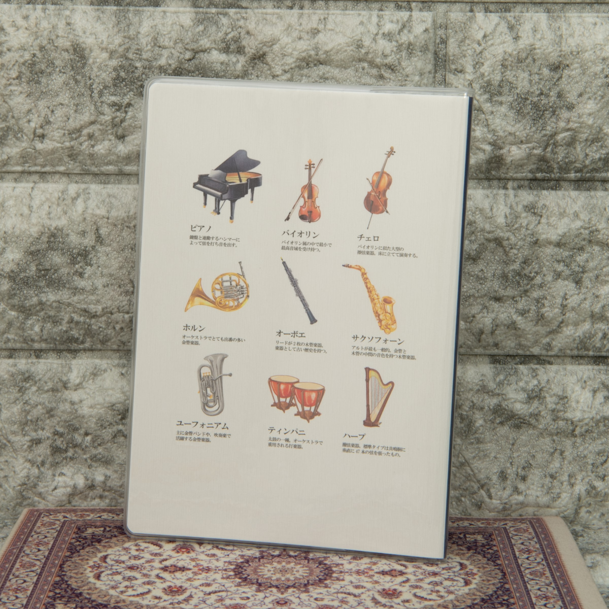 造形が美しい楽器のイラストが表紙に描かれた、マンスリー手帳。