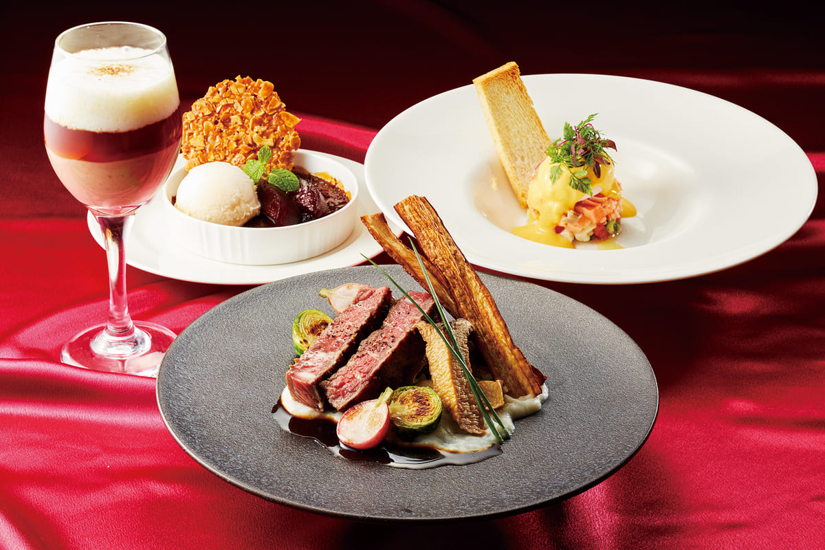 アンガス牛や帆立などリッチなオードブルに、季節限定スウィーツの数々。