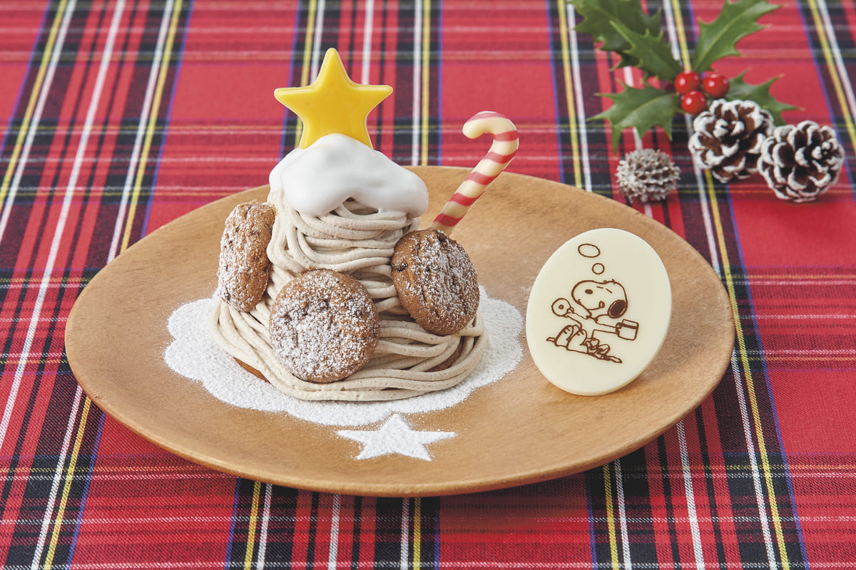 大好きなチョコチップクッキーをオーナメントにした「スヌーピー」が想像したクリスマスツリーのモンブランケーキ。