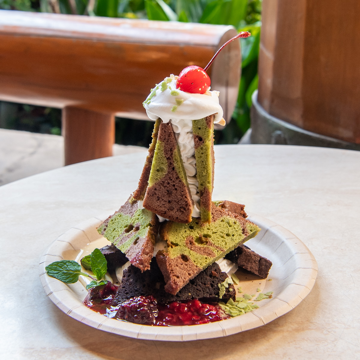 ワイルドな迷彩柄とたっぷりクリームで雪化粧したようなスイーツ。