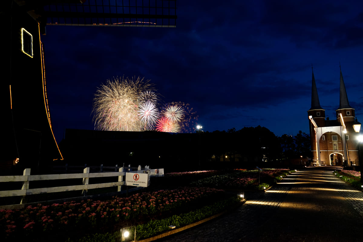 「フラワーロード」では、風車の向こう側に見える花火の様子が幻想的です。