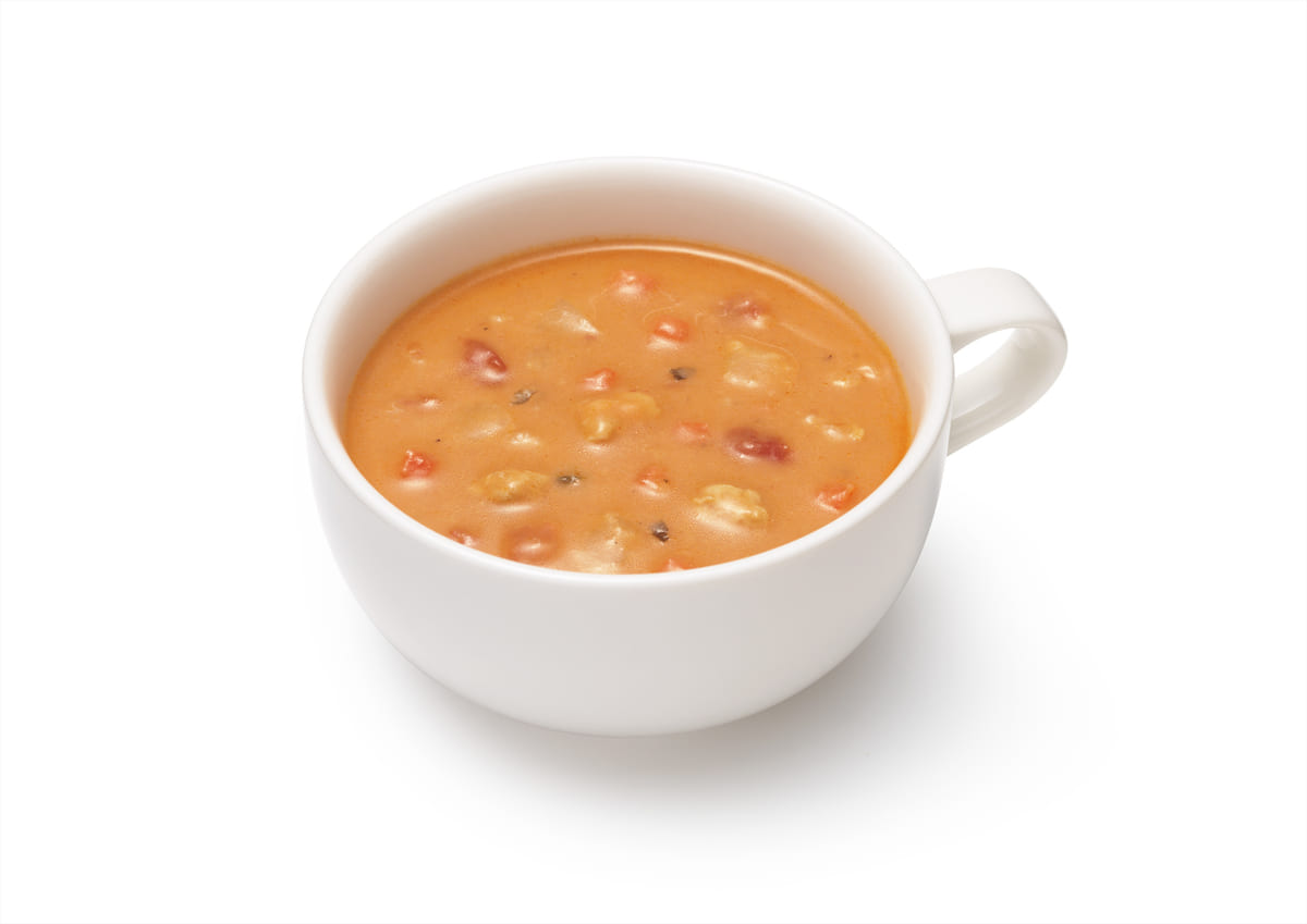 トマトの風味と濃縮乳、クリームなどのコク深いスープベースに、玉ねぎ、にんじん、鶏肉が入ったやさしい味わいのスープ「トマトチキンチャウダー」