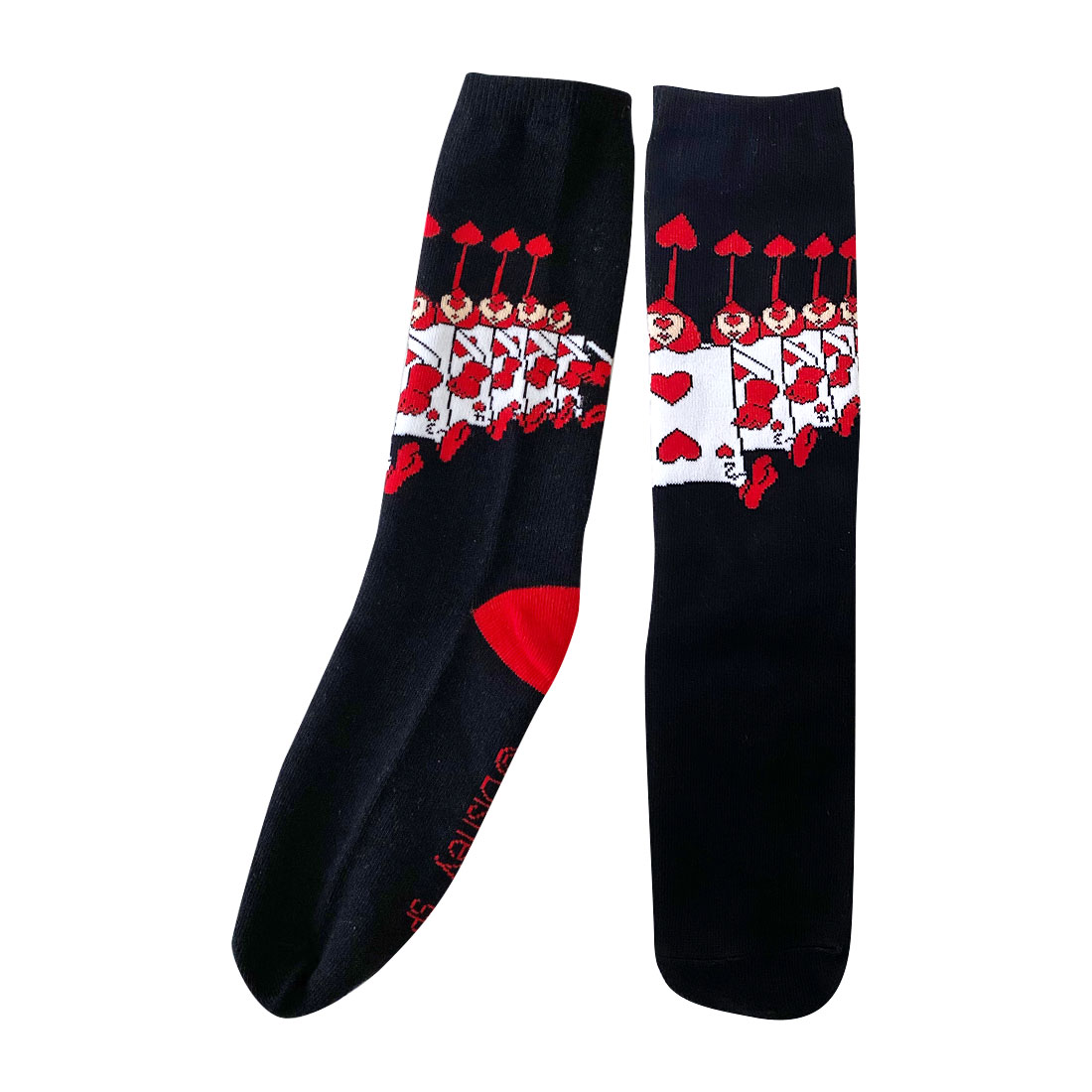 「ハートの女王」のお城を守る「トランプ兵」たちの行進をデザインに落とし込んだソックス。