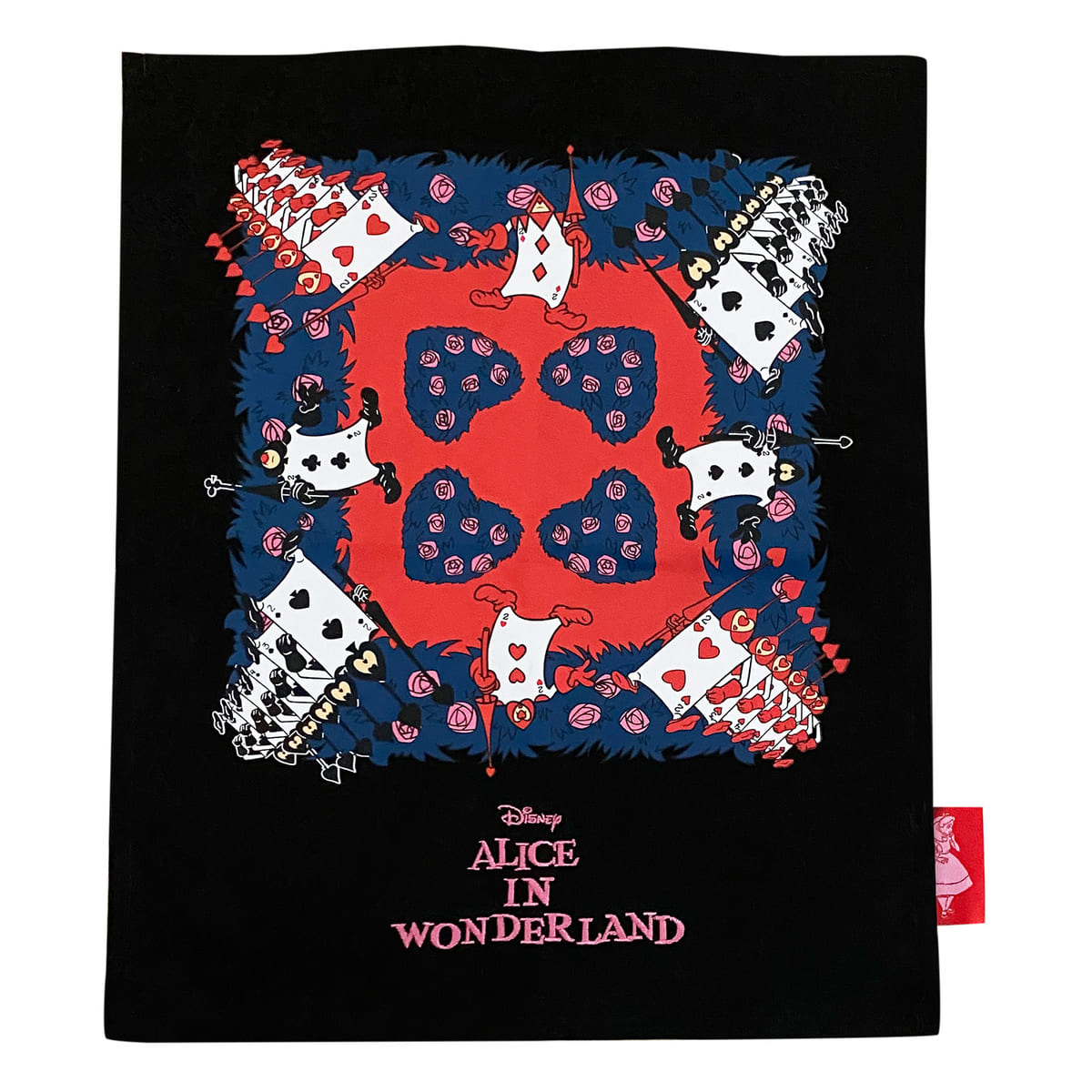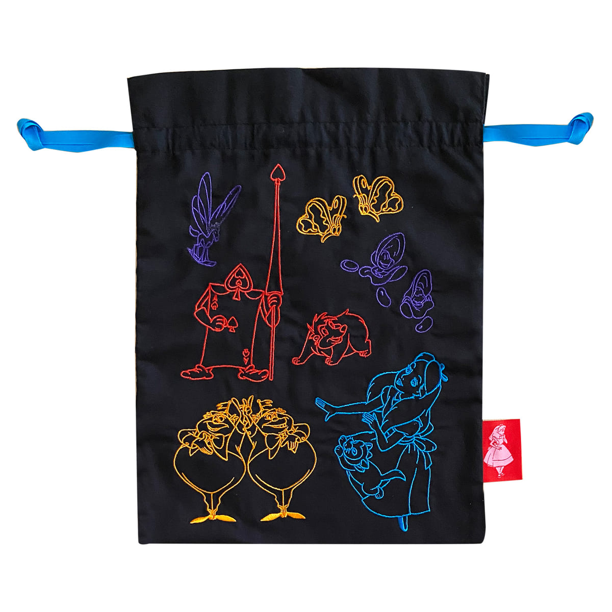 黒地に、カラフルな糸で「アリス」や飼いネコ「ダイナ」など、劇中に登場する個性豊かなキャラクターたちをデザイン。