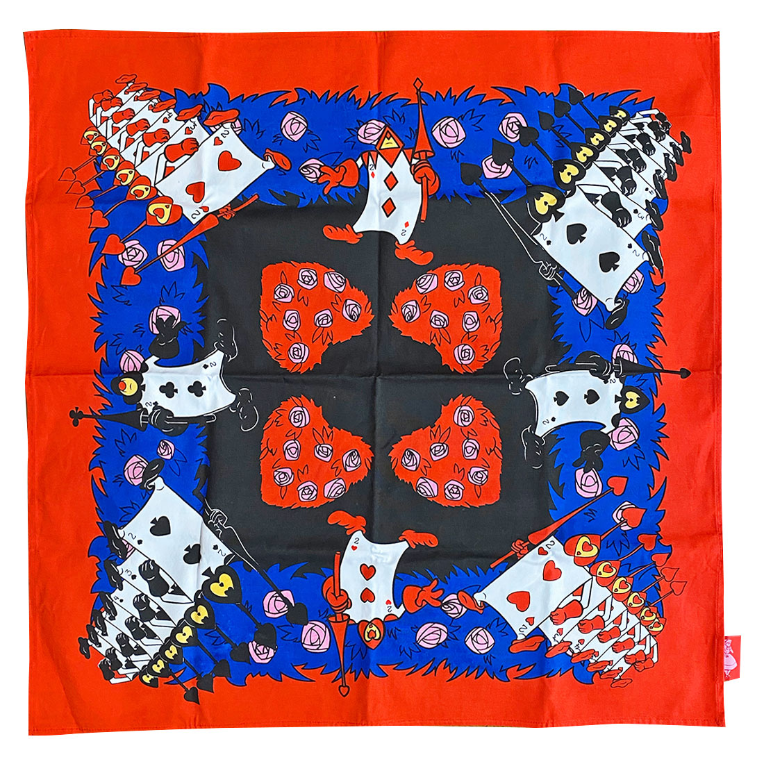 中央にハートの「トランプ兵」たちをレイアウトした赤いクッションカバー。