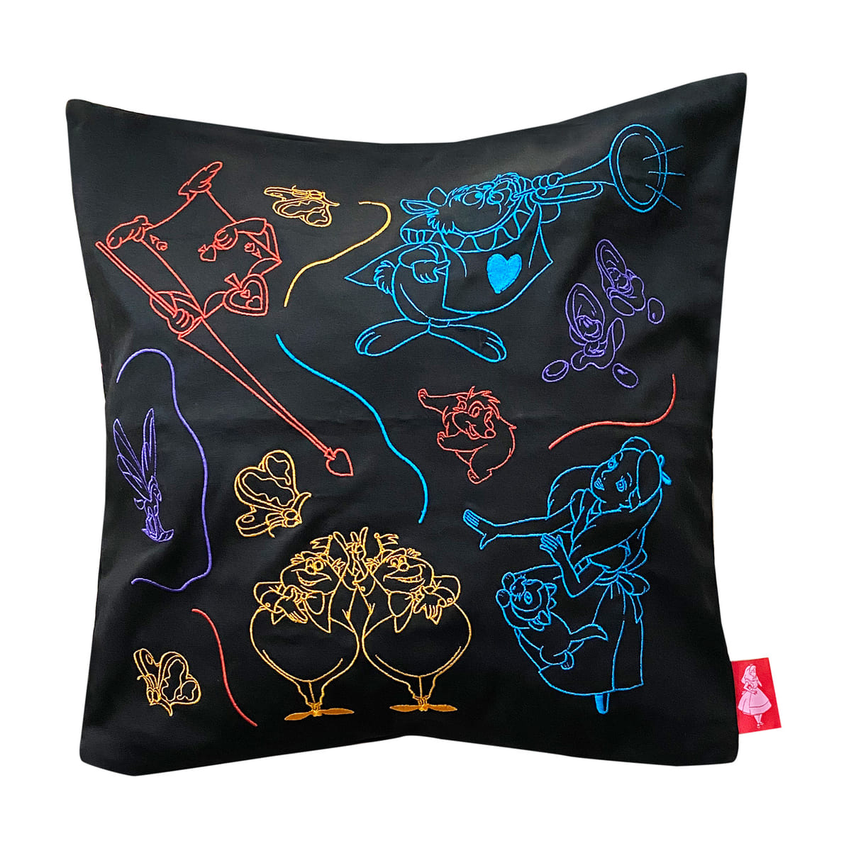 黒地に「アリス」たちのラインアートをのせたクッションカバー。