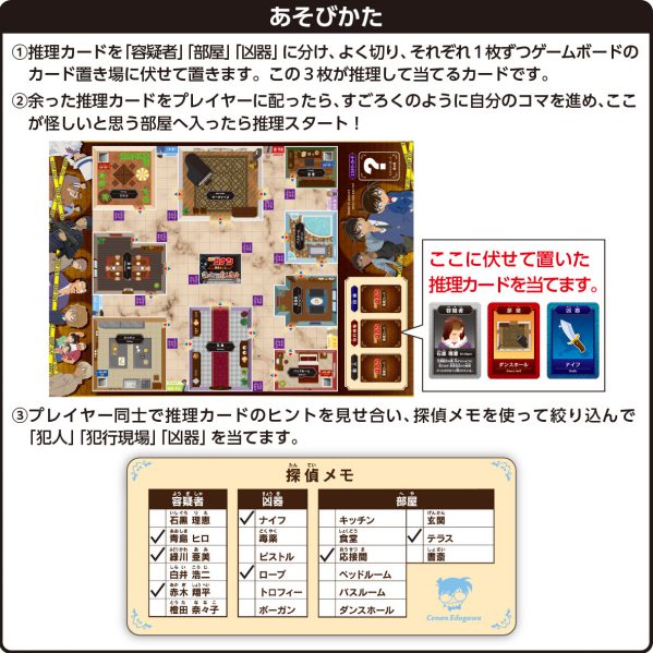ある屋敷で起こった事件の解決を目指し、「江戸川コナン」「服部平次」「安室透」らになりきって「だれが」「どこで」「なにで」殺したかを推理する3~6名で遊べるパーティーゲームです☆