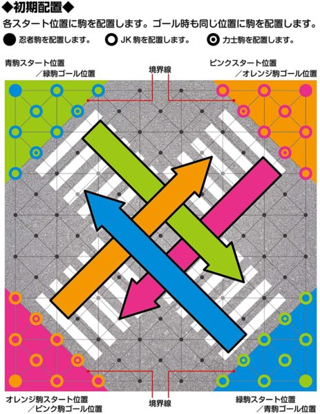 セット内容:ゲーム盤 1枚、駒(各4色) 忍者駒4個/JK駒24個/力士駒8個