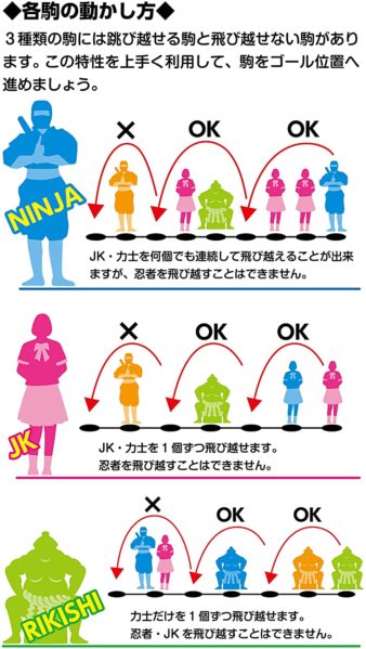 コマには「NINJA」「JK」「RIKISHI」の3種類があり、それぞれ他の駒を飛び越えられる条件が違っています。